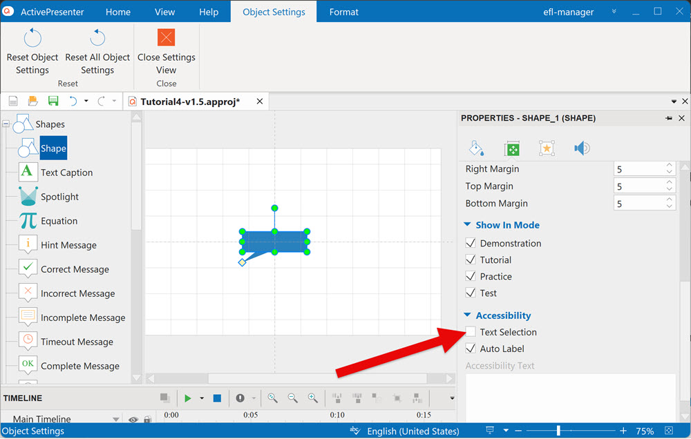 In Active Presenter we can turn off the ‘Text selection’ of ‘Shapes’ and Text Captions’. By turning off the ‘Text selection’, we prevent users from accidentally selecting objects in the game.