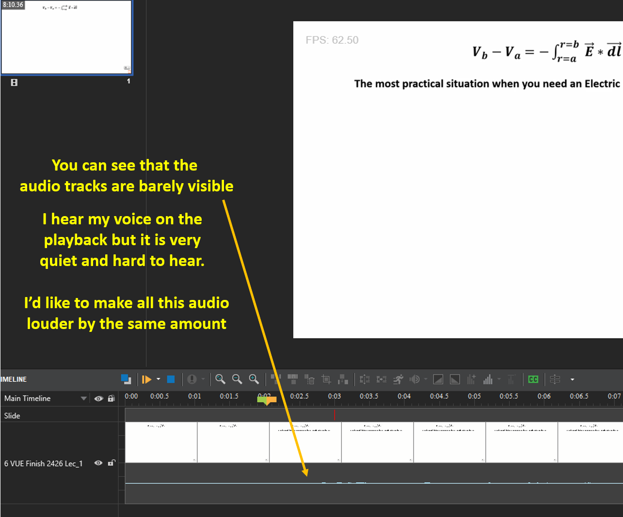 I inserted a video where the volume looks to have been set too low. You can tell because the audio tracks have minimal amplitudes in the screenshot below. I hear my voice on the playback and I hear everything I wanted to say in this prior video but it is hard to hear. Is there a way to boost the volume of the overall audio component of this video without having to re-record the presentation in a louder voice?