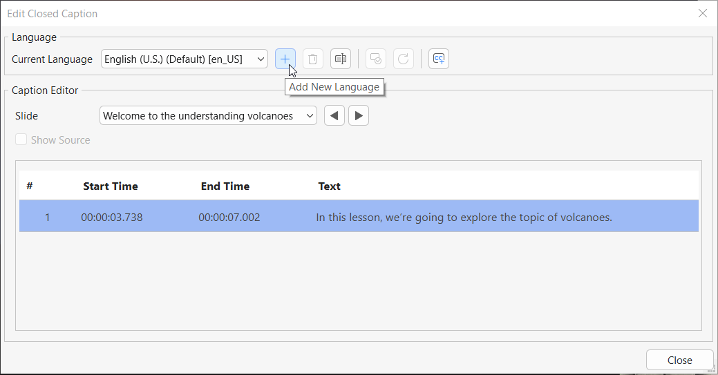 Therefore, if you want to add an additional subtitle language, you’ll need to create it directly in ActivePresenter and then edit the text for each closed caption. (Insert > Closed Caption > Caption Editor)